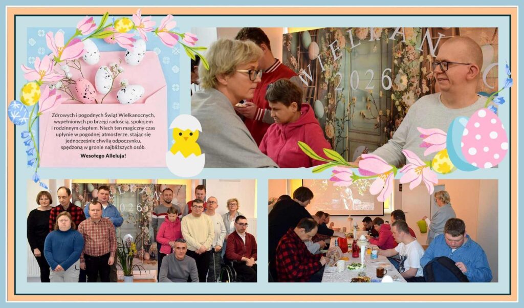Okres przedświąteczny zgromadził uczestników warsztatów i kadrę. W świątecznie udekorowanej sali panowała atmosfera radości i wzajemnej życzliwości. Tradycyjnie nie zabrakło symbolicznego dzielenia się jajkiem, składania życzeń oraz wspólnego, symbolicznego poczęstunku.
